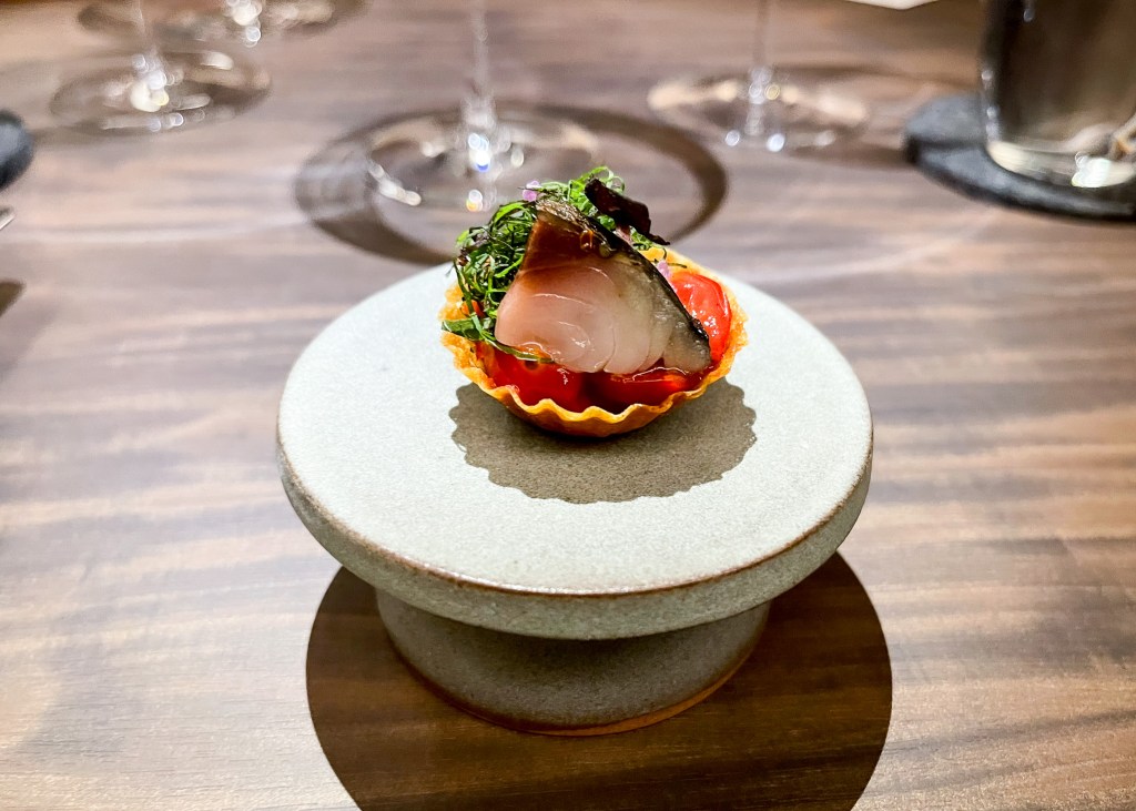 第一道開胃點心是「煙燻鯖魚塔」,它是以煙燻日本鯖魚搭配切絲的紫蘇葉襯上一小朵紫蘇花,而底部是醃漬的酸甜義式番茄以及微酸清甜的果泥。