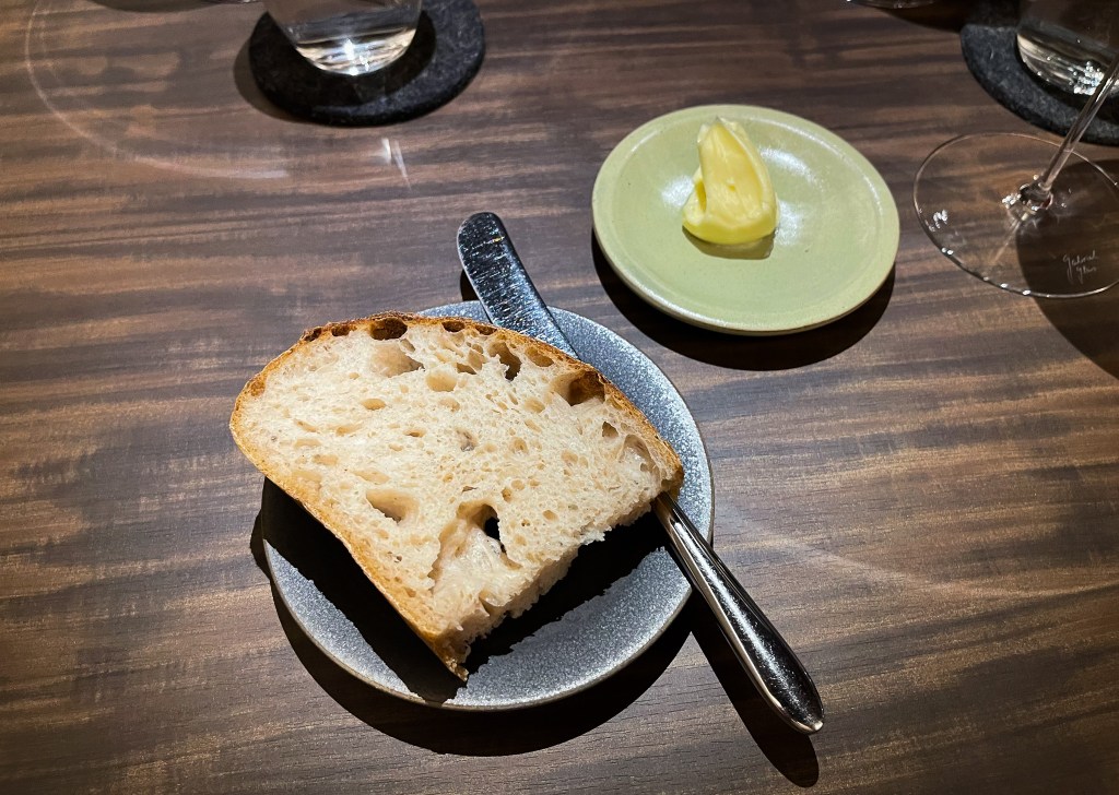 供餐的麵包是一款全麥酸種麵包,以及一塊光滑的有鹽奶油。皮脆肉嫩,清楚的麥芽香,咀嚼許久便能感受所謂酸種的酸。