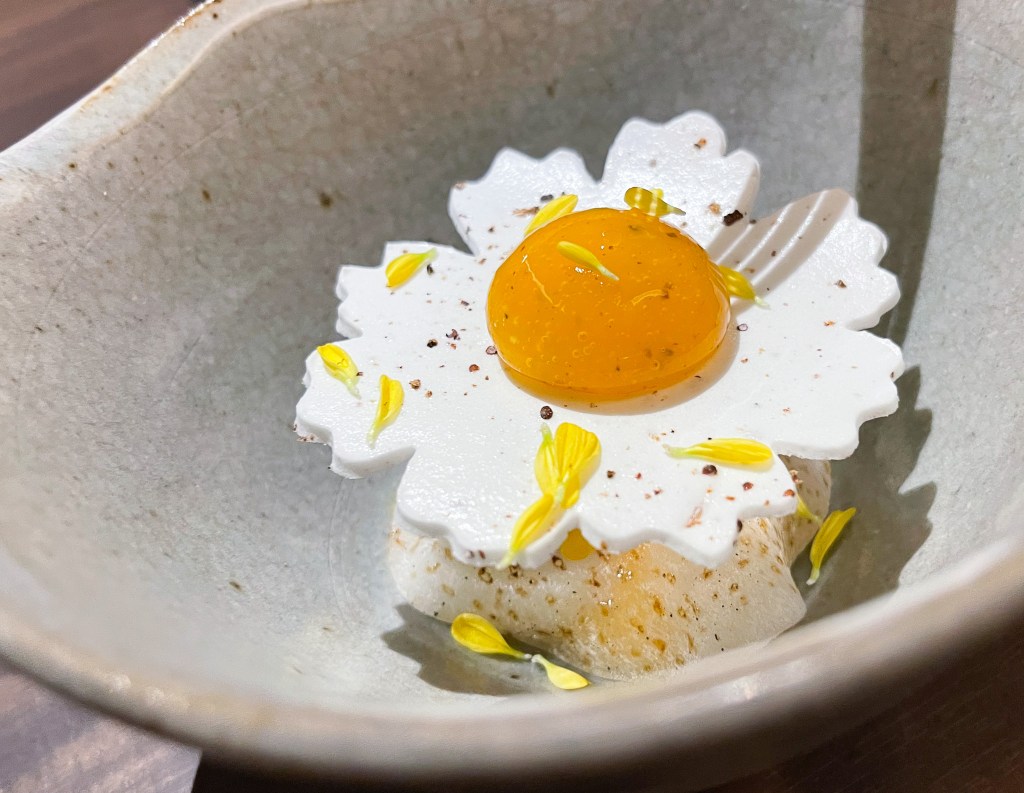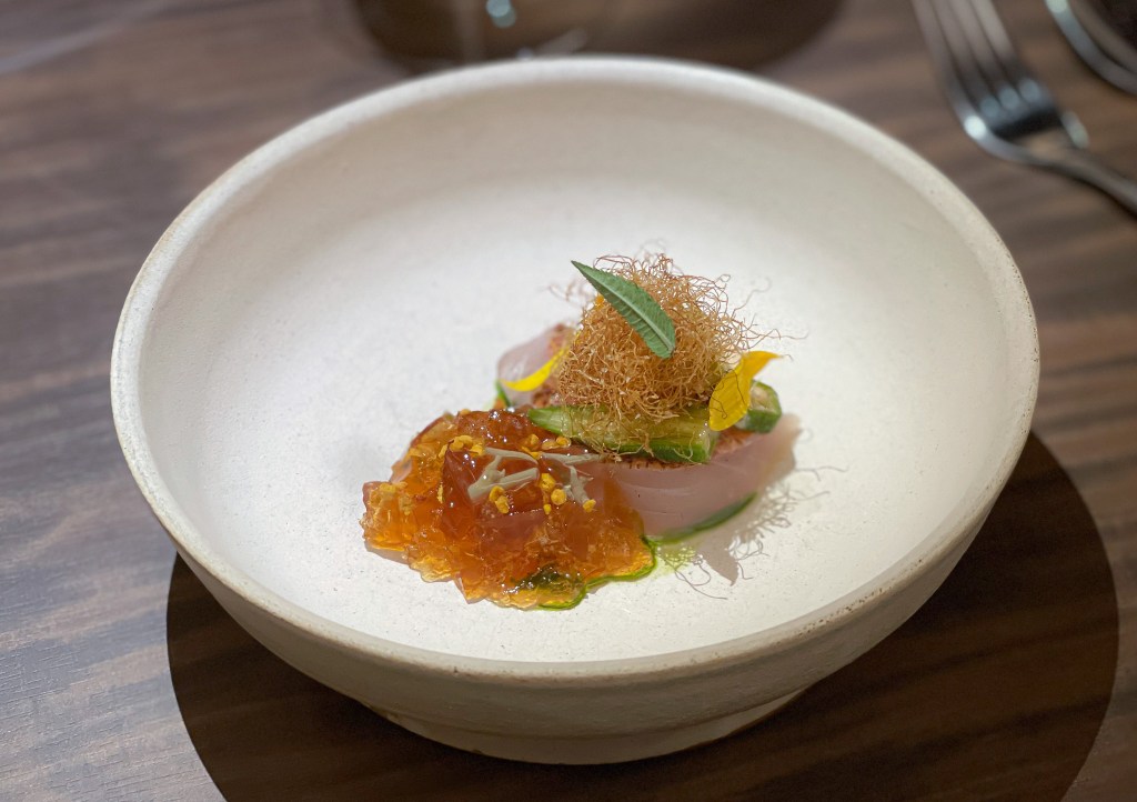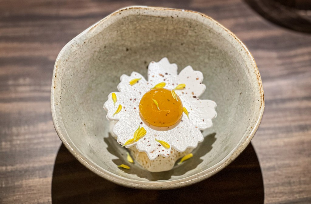 接著服務人員送上了第二道菜是CHARCOAL KISSED KINMEDIA(ROASTED CORN TOSAZU, OKRA, BEE POLLEN)。