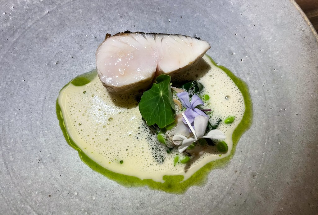 今天的第三道菜服務人員端進的是SPANISH MACKEREL COOKEDOVER CHARCOAL(SPINACH, VERBENA WHEY)。