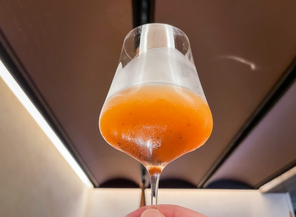 搭配橘酒,原本以為會平淡度過,但還挺有層次的,尤其橘酒的果香,輕盈橘香,一點礦味,瓦味,酸啤酒的淡淡皮毛味,正與生食和輕盈食材有了些層次表現的滋味。尤其稍稍帶起這款橘酒的味道,果香以及微勁的酒感,相當不錯。