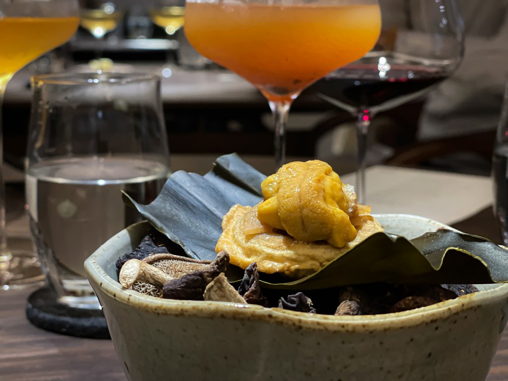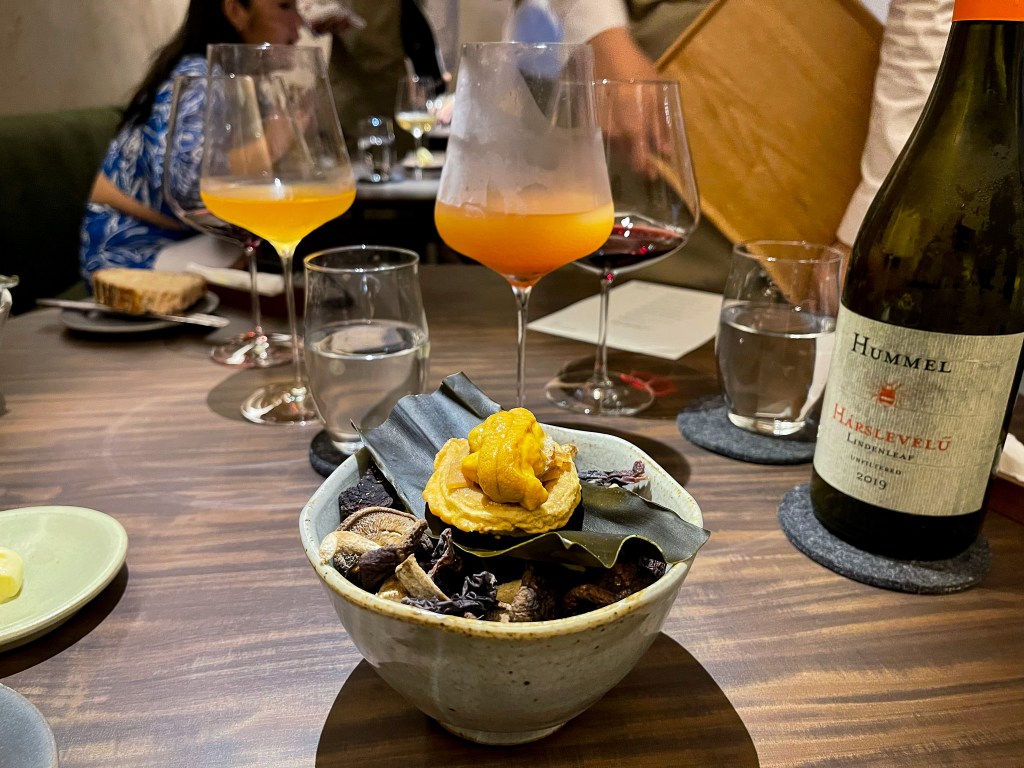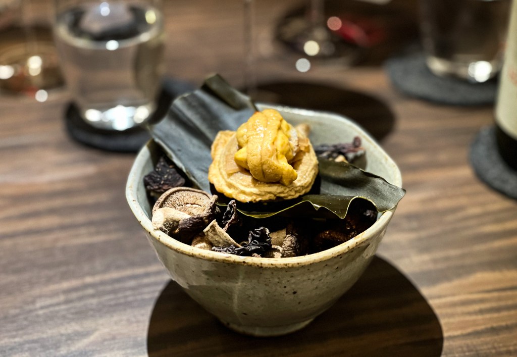 今日第四道菜是CRISPY SHITAKE MUSHROOM & SEA URCHIN(HAZELNUT CARAMEL & KAMPYO)。