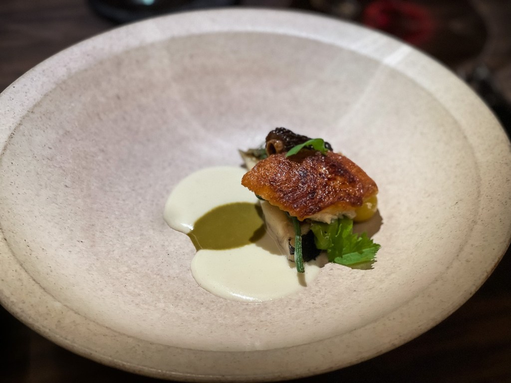 這道無論是醬汁帶著圓潤的溫和氣息以及本身是辛嗆材食材所表現的是不辛嗆而稠密,雞翅肉嫩汁香,皮葉十分脆口,羊肚菌以及一些蔬菜的風味。