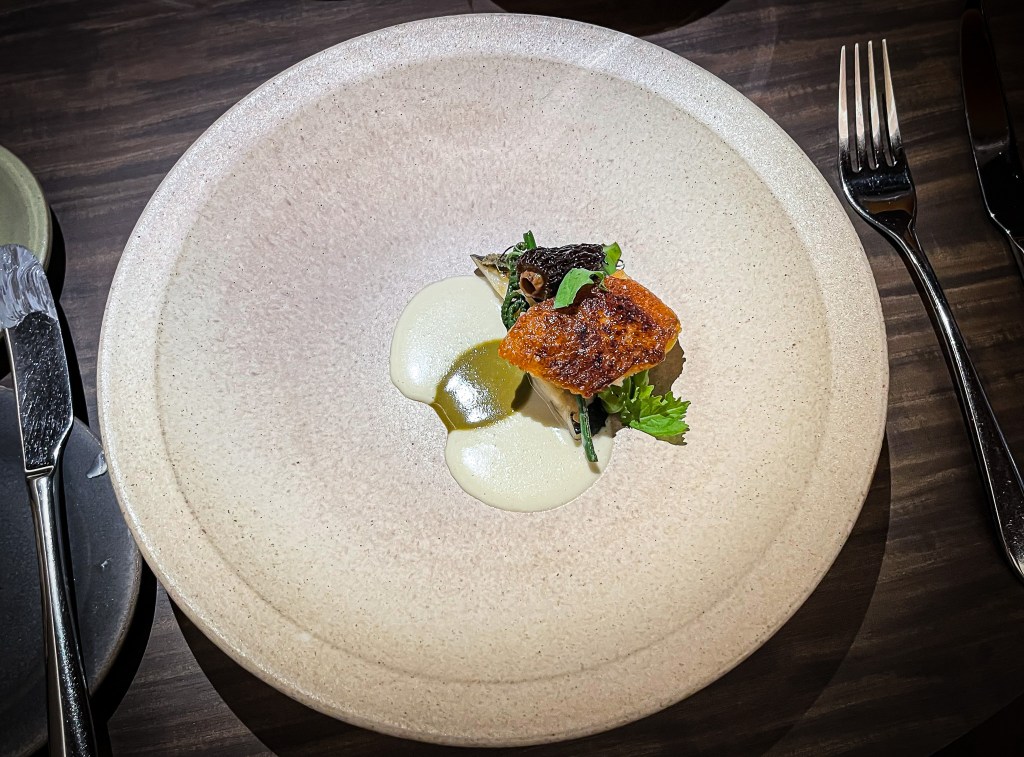 欣賞彩色後直接切下叨起魚肉,微醺生食溫和軟嫩自然清雅的魚肉滋味。與秋葵、炸玉米在口感上表現一種微脆與滑滑的鹹香感,當然還有些可口的青豆以及一旁煙燻到奶油,讓我有不同層次的味覺撞擊。搭配一旁輕酸滑溜的醋凍讓海鮮表現一種像是熟嫩與生魚片沾醬感。