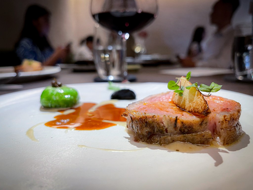 這道料理開始搭配薄酒萊村莊Gamay,尤其鮑魚軟嫩沾醬更濃香美味。而這款葡萄酒光是氣味就無疑是Gamay,紅焦糖相比、紅火龍果那種帶有口紅味道的香料味,紅櫻桃、草莓、葉綠植物,清新舒服,口感相當光滑順暢,有種小清新水果香。