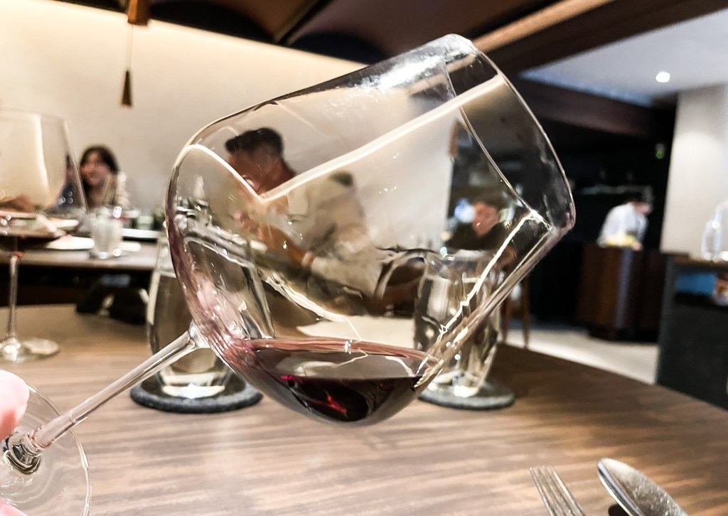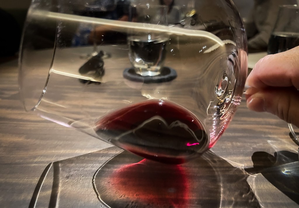 色調,當酒注入杯腹寬胖的布根地酒杯中,在玻璃杯中,呈現出深厚黝黑而不透光的深紅寶石色調,二燈光照下微微反射形成一種紫黑。
