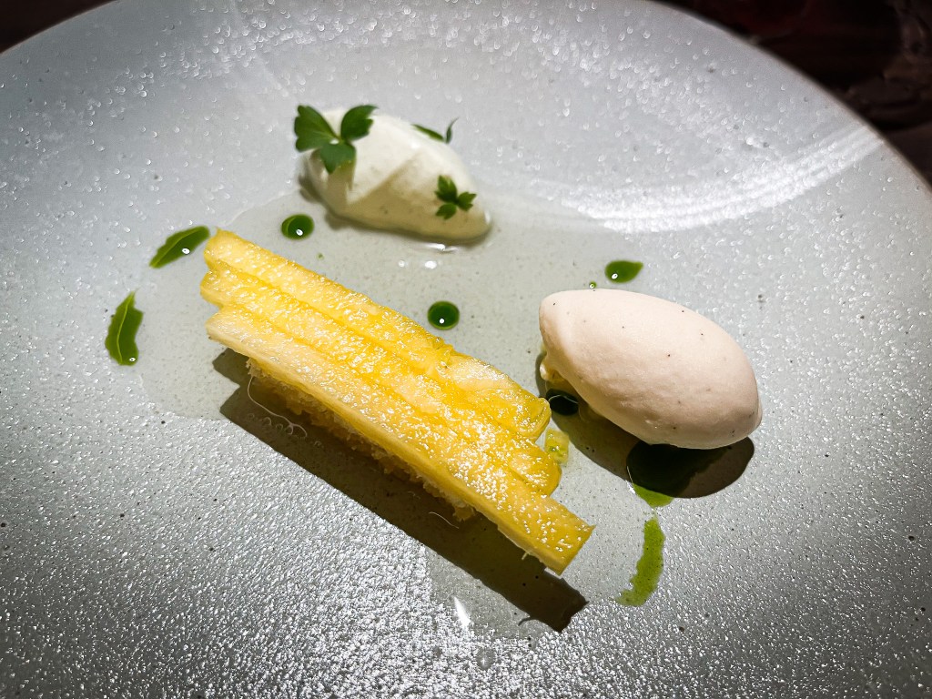 今日第一道甜點IRWIN MANGO(SAKE LEES CHANTILLY & GRILLED MOCHI)。這道甜點是一款以愛文芒果為主角的花樣點心,除了香甜氣味出眾的芒果外,它還有用清酒酒粕調和。