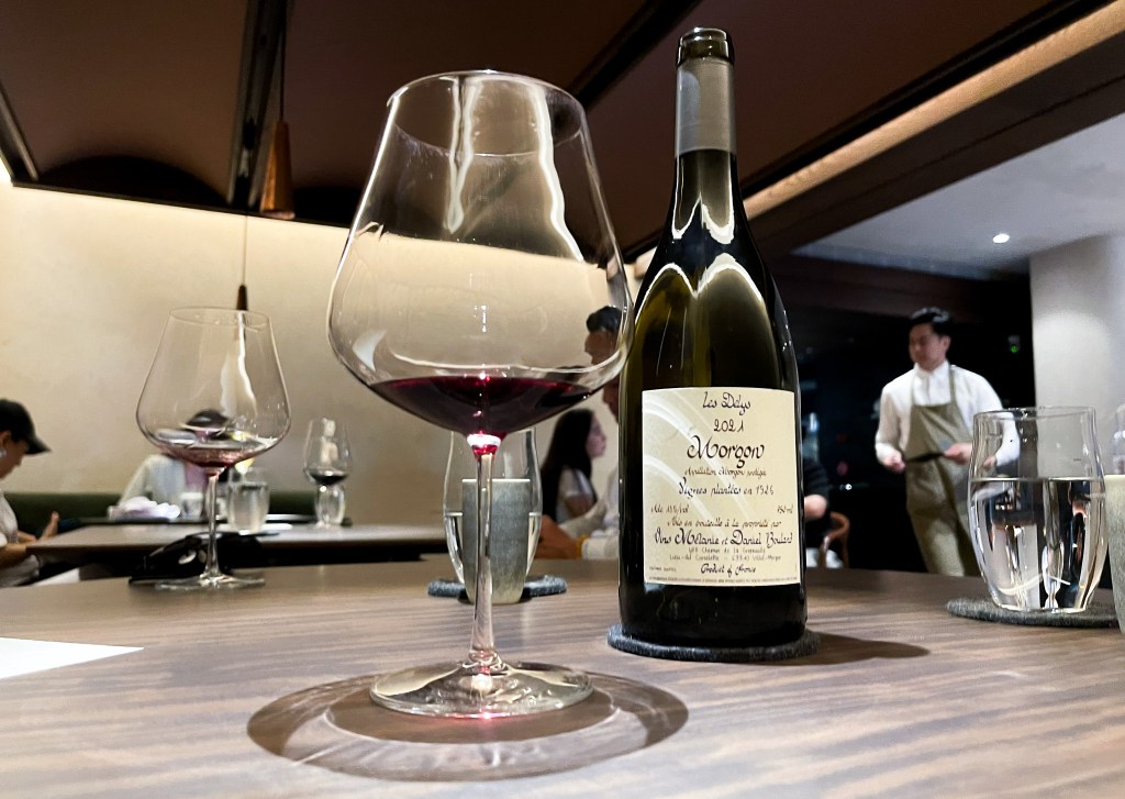 好的,接著品味今天的紅酒,為後續搭餐持續開味。接著,侍酒師用開啟了來自法國布根地的薄酒萊區葡萄酒Daniel Bouland Morgon Les Delys 2021(產地:France 產區:Burgundy Beaujolais-Morgon 葡萄品種:100%Gamay)這款同樣也是歐陸葡萄酒。