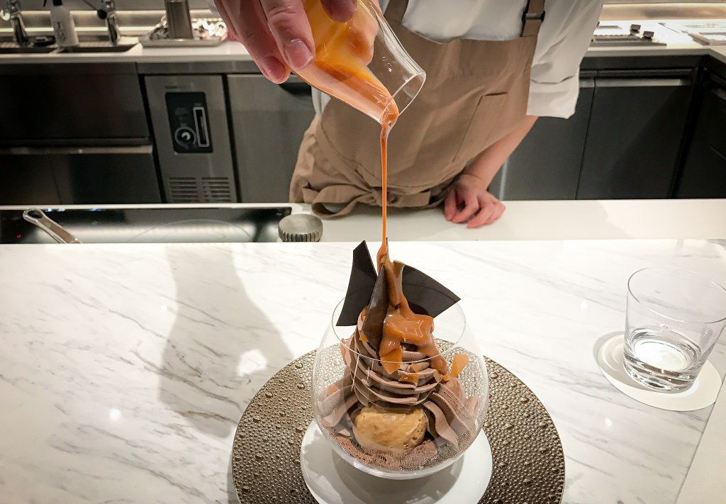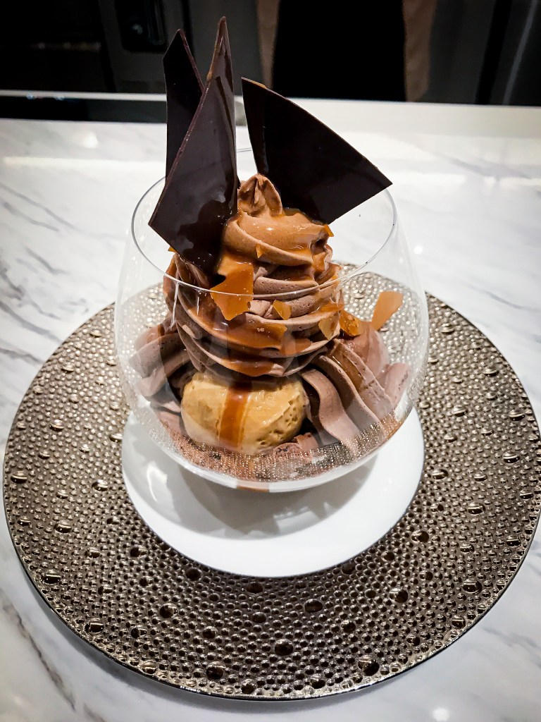 第一道點心甜點師用的材料以及製作有濃郁的巧克力,巧克力慕斯,巧克力冰淇淋,巧克力馬卡龍,太妃糖,焦糖牛奶冰淇淋,最後淋上海鹽焦糖。