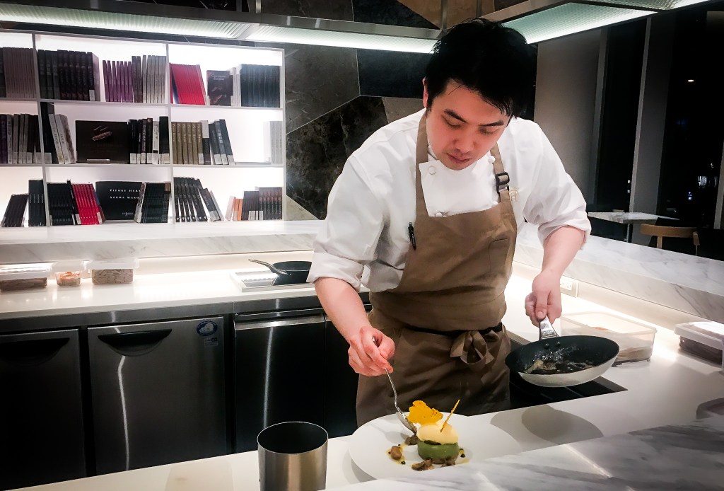 甜點師先以栗子、沙糖、刮些香草籽調製,然後取出盤子將主體抹茶風味的布蕾與風味餅等,放在潔白的盤面,同時迅速擺盤。這道以百香果風味為主的點心,說真的很難不著迷。