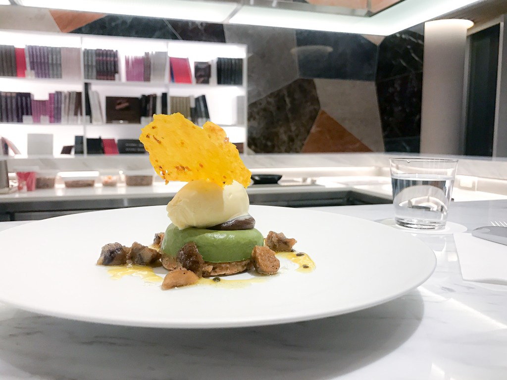 第二道點心是用栗子、百香果泥,抹茶慕絲布蕾以及襯底的栗子口味及百香果風味的餅等層疊製作。