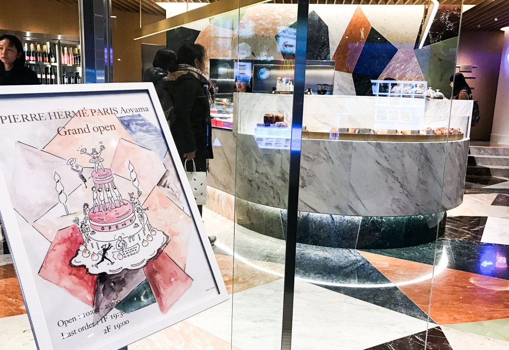 為了確定,我再刻意走近店門口,ㄟ沒錯啊…這是Pierre Hermè Aoyama!!原來…店面是改裝。我看了一下門口告示,是一個長開雙手呈大字型的插畫女孩,告示上寫著Grand Open。