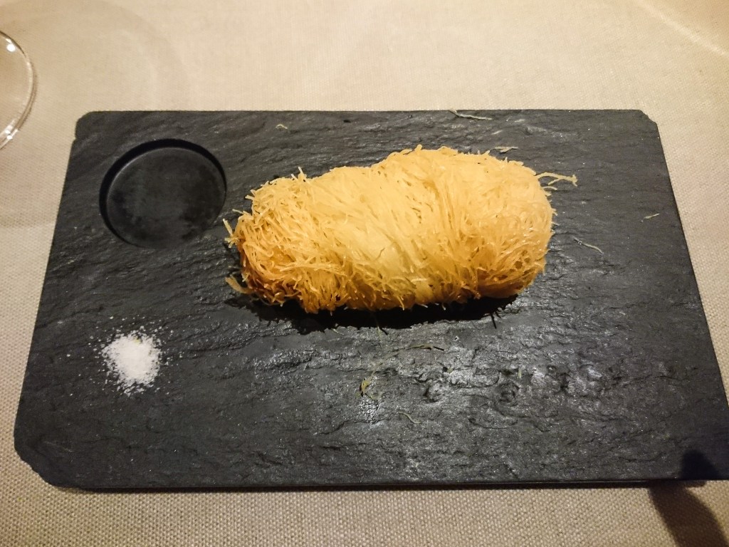 這道料理是一款不常見的炸蝦表現方式,外層包裹的是中東麵線kadaif(話說我起初以為是米粉,經過解惑方才了解)。這料理炸的十分香脆,內餡包的蝦肉也十分厚實鮮嫩,沒有怪劑雜味,所流露的蝦汁也十分鮮美。