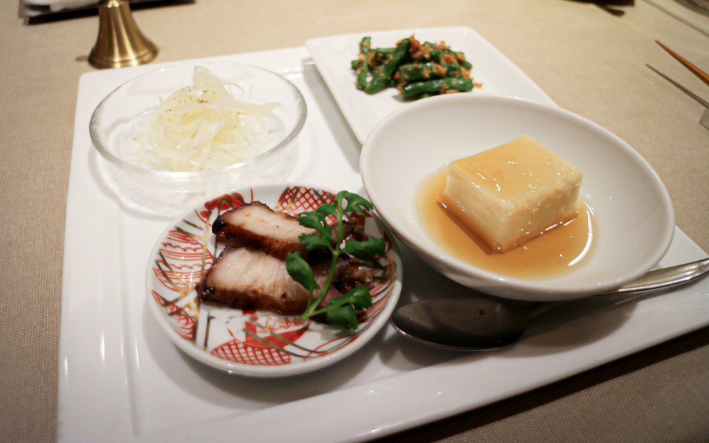好的,完成品味今天點的葡萄酒後,很快的第一道前菜便由服務人員們端了上來「Piling match of four kinds of appetizer」這道冷盤是由蛋豆腐、馬鈴薯絲、四季豆佐甘貝蝦仁、叉燒肉等等樣式登場。