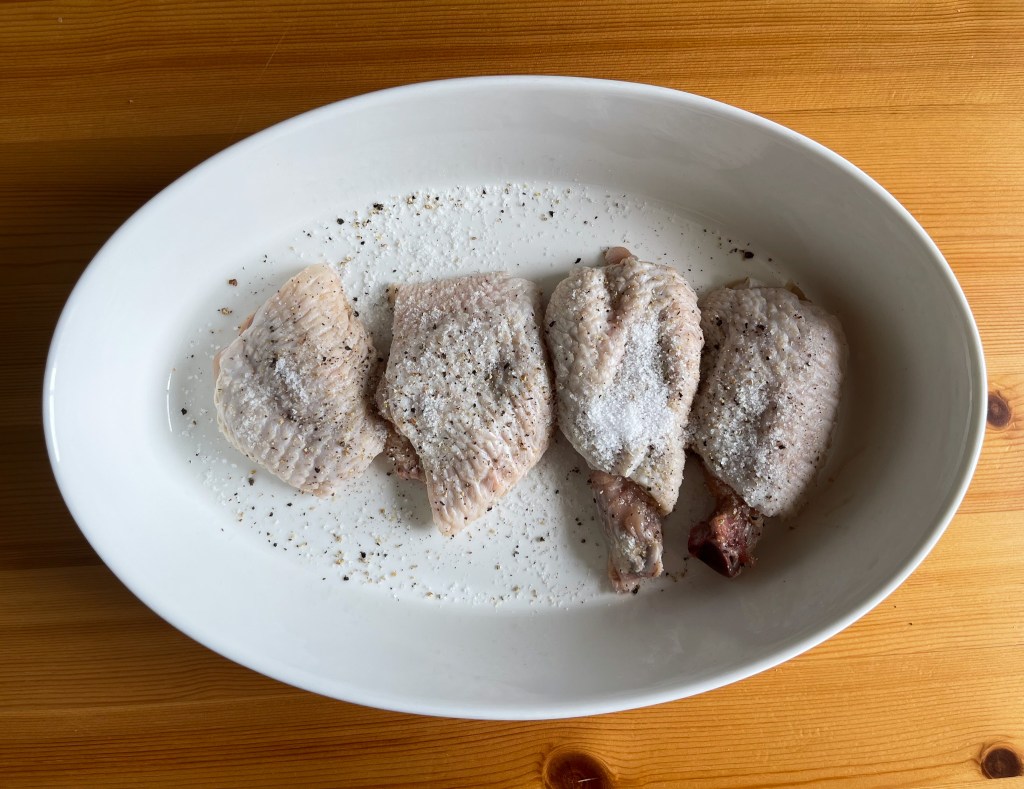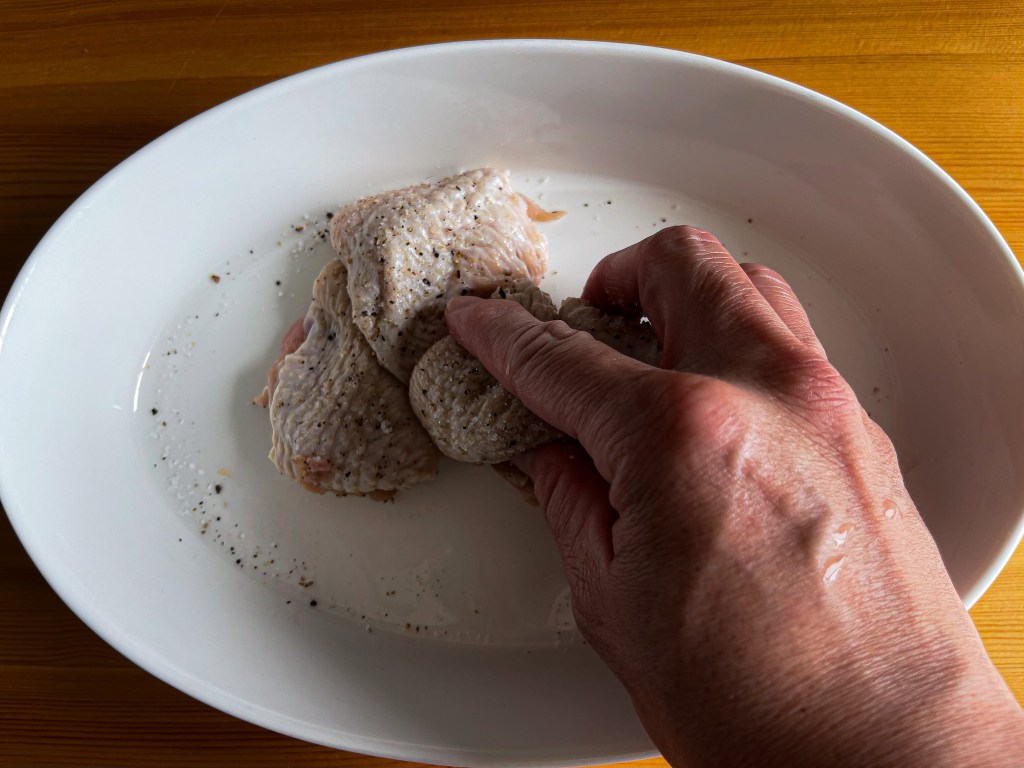 所以我將事先買好的土雞拳洗淨擦乾,鹽巴以及黑胡椒醃漬。用保鮮膜包覆,送進冰箱醃漬,待今日午間運動過後,回到家我再來料理今天想做的小料理「雞肉棒棒堡」。