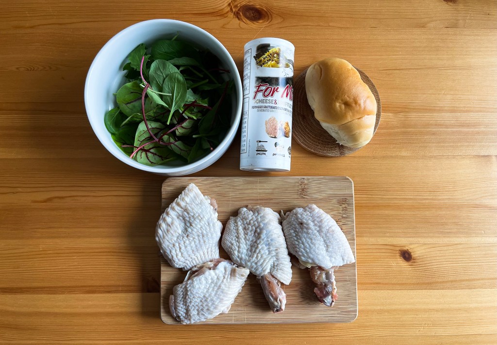 運動完,回到家前,我經過超市買了些食用生菜作為夾心,以準備實現一個臨時起意的小食物。打開保鮮膜,將雞肉上的醃漬物洗淨並擦乾,然後將所有需要用到的食材取出,並做整理,再思考一下要如何做。