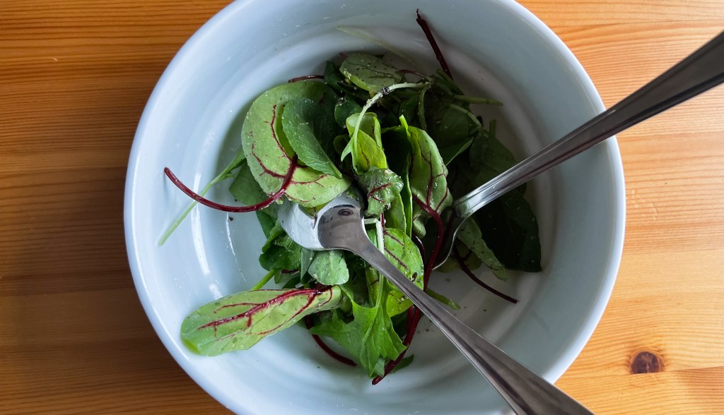 接著將食用生菜放入碗中,添加少許鹽、黑胡椒以及林上風堂將,然後用一組湯匙作翻攪調勻,放置一旁備用。