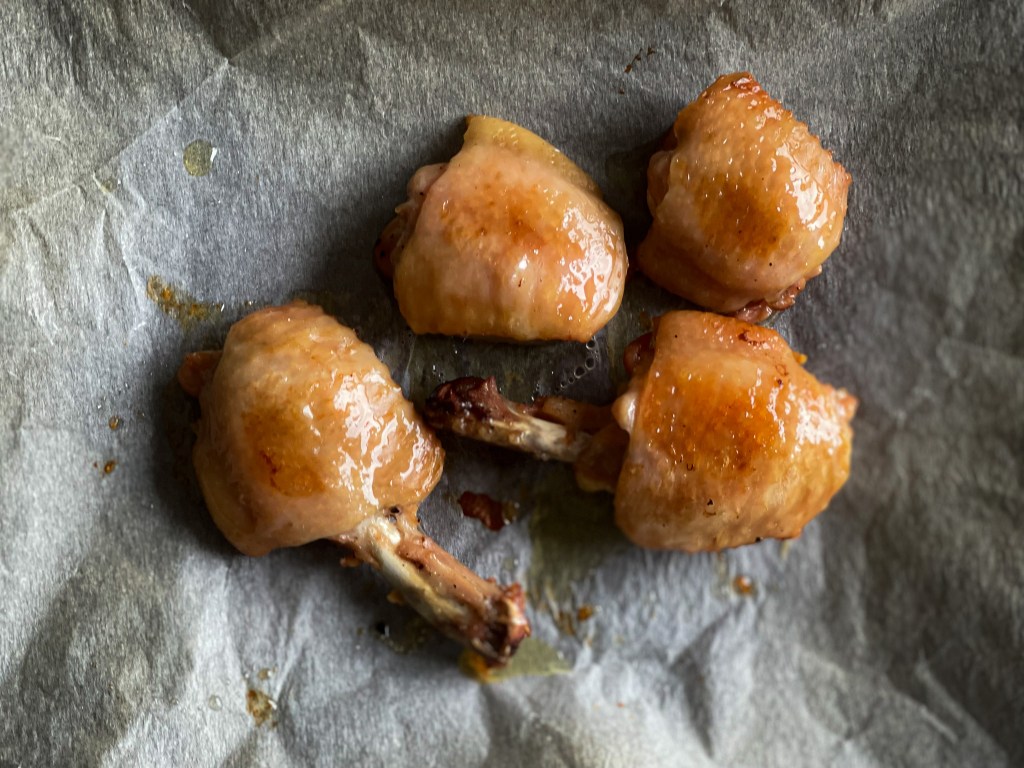 我先熱鍋,再將土雞拳皮面朝下開中火煎烤焦化後翻面,兩面都上色後。我預熱烤箱,並準備烤紙,將煎好的雞肉放上,然後送進烤箱,先180度正反面各烤10分鐘。