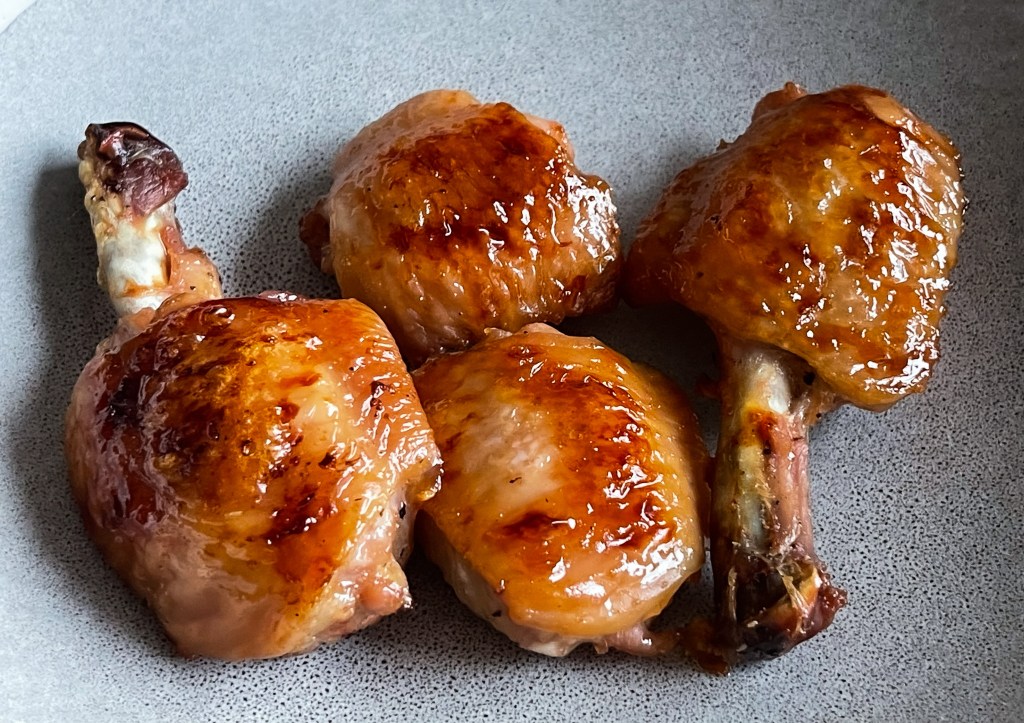 我將烤好的雞腿取出先放一下,準備蜂蜜倒入小盅,然後用烤肉刷沾點蜂蜜塗上烤好的土雞表面,再送入烤箱220度烤10分鐘。