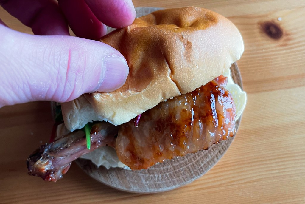 再將骨頭取出的土雞肉放上,再淋上雞油而完成這一款「雞肉棒棒堡Tapas」。