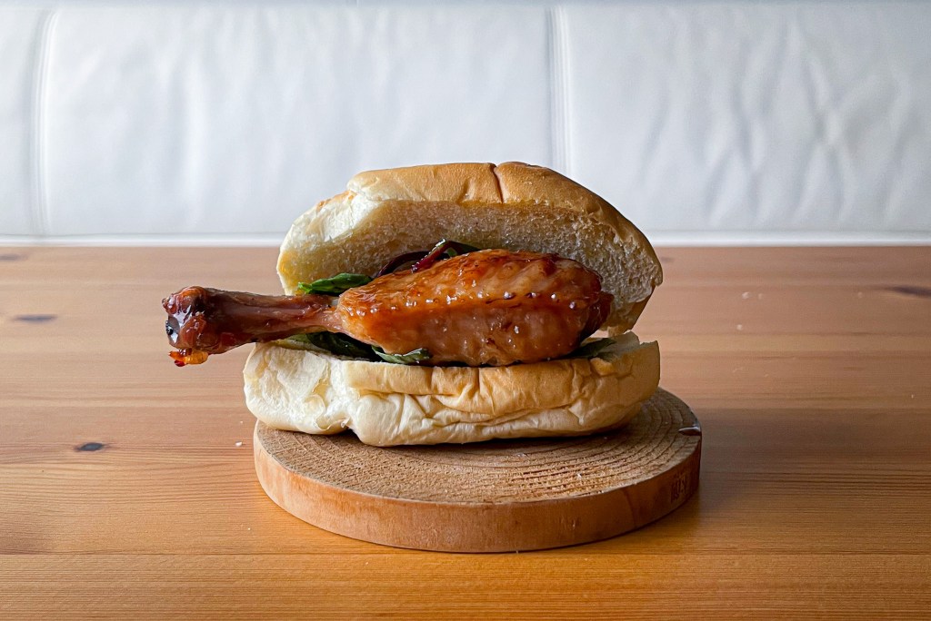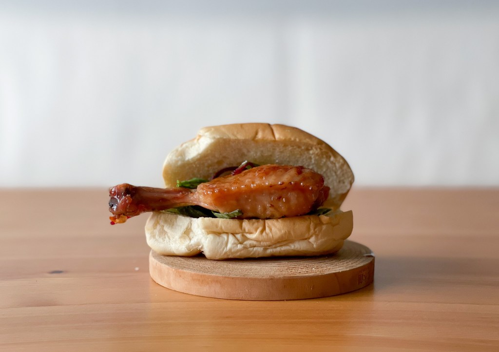 第二款用成三明治夾心,取起入口,口感多了如吃雞肉漢堡的飽足感,味道一樣可可香甜。吃的時候可以慢慢將骨頭抽出,而第二口直接嗑下咀嚼,享受美味的雞肉棒棒堡。