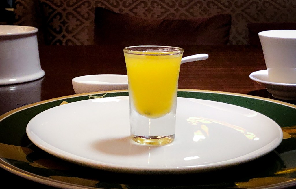 通常在粵菜餐廳用餐都會有這樣的小品,開胃醋。但對於不同餐廳抑或是配合不同時節也許會用不同的果汁來變化。直接飲下,比起新鮮百香果汁其實好像差不多,就如英文字根的表現一樣,會讓人感受熱情歡愉的飲品。