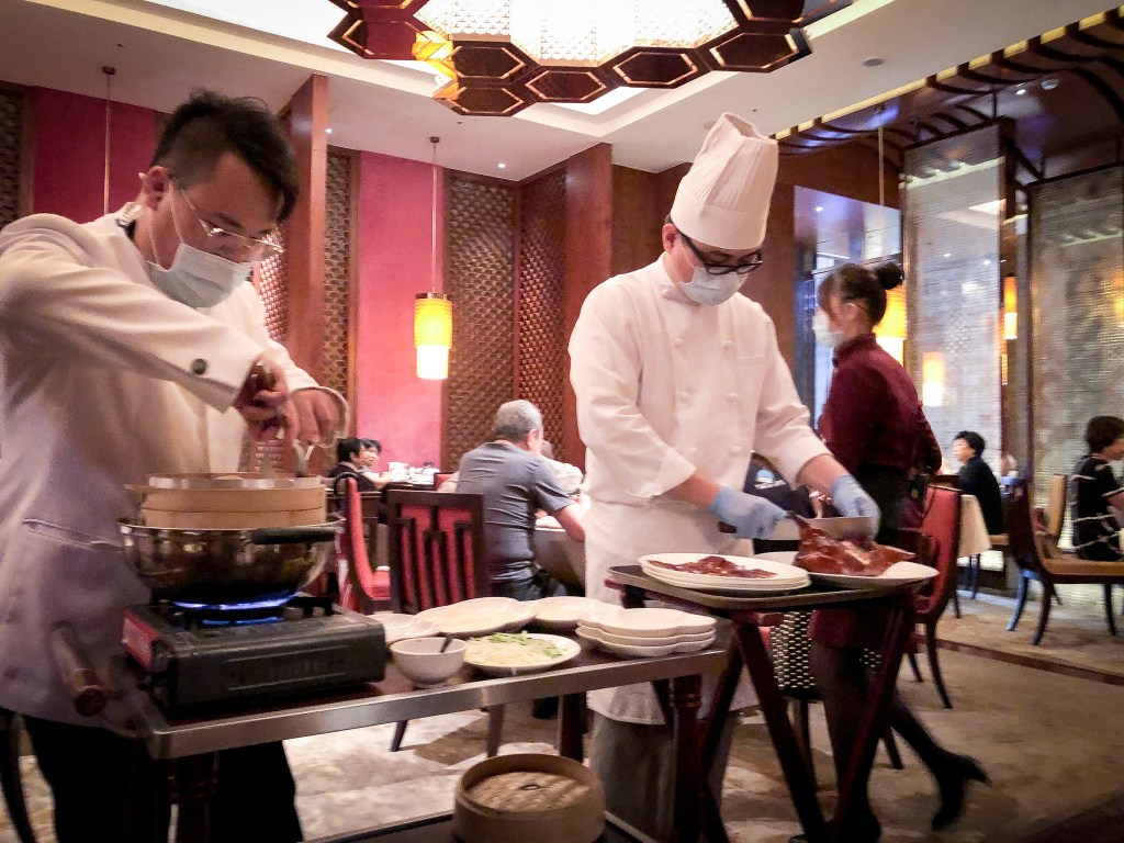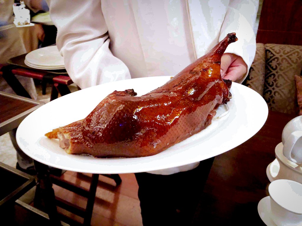 最後會將剩餘的鴨肉、鴨腿鴨架做成鴨肉盤料理而端上。我夾起一塊品嚐風味,嗯嗯…不錯,甜香可口,多汁醬美,大飯店的鴨肉果然厲害,絕不能以燒臘店的鴨肉用做比較,尤其香、嫩油而不膩,可口好吃,我喜歡。