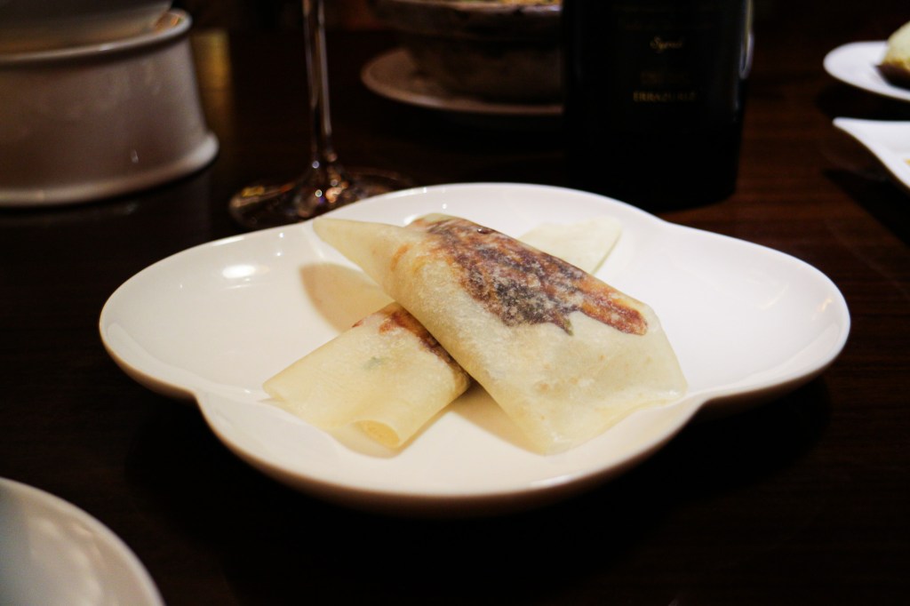 儘管只是半隻,料理程序一樣不變,由一位師傅將半隻鴨一刀一刀的將外層皮肉畫下片皮,另一位助手則用麵皮包成鴨肉捲,那麼就分開來感受並述說滋味吧。