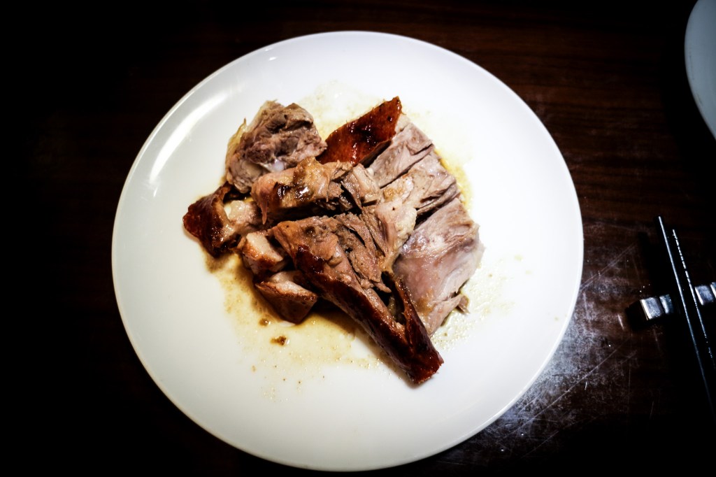 先說結論“好吃”,雖然是制式的、簡單的捲摺,但滋味與風味則未曾流失。麵皮彈薄、塗上的甜綿香甜的醬料,吃下直接感受是肉片柔嫩,皮脆而香,裡頭配搭黃瓜新鮮脆口多汁而不突兀。蔥蒜與細蔥添加辛香氣。將這一捲一捲的慢慢細品,美味焦香讓人愉快,這捲的綿甜風味真好。