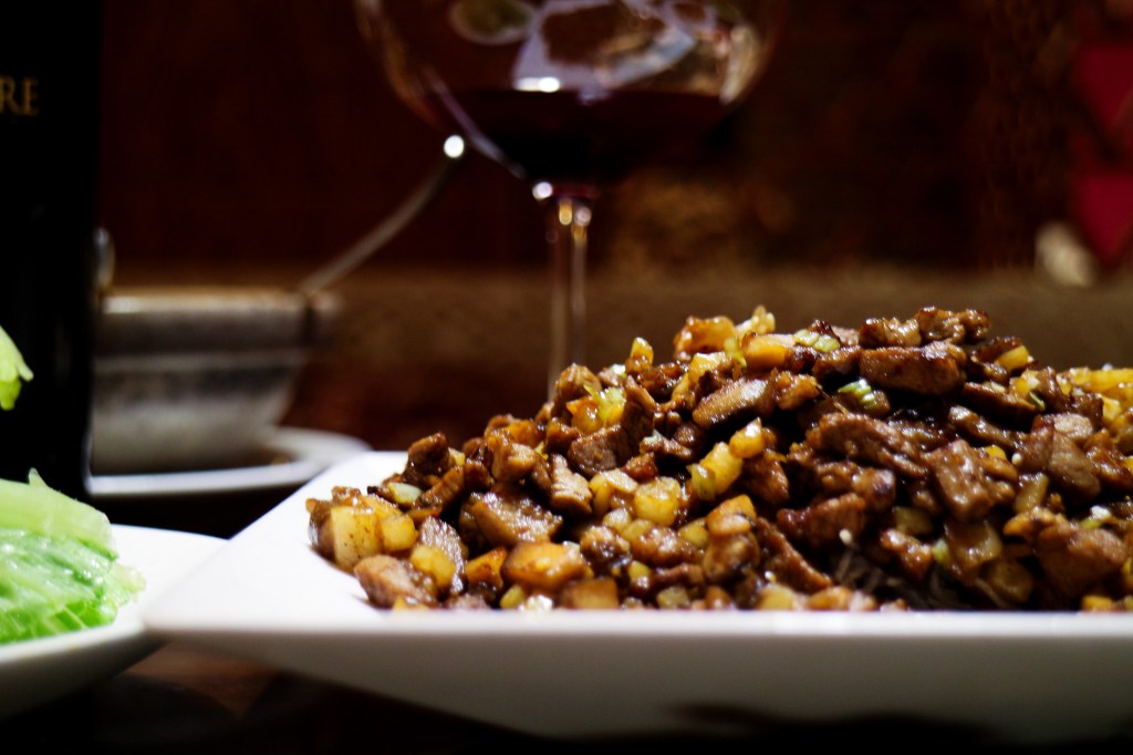 搭配La Curmbre Syrah,其滋味就像是警匪動作片,整個暴力、激烈,酒的口感酸澀,尾韻青澀,但好在還有點回甘乾爽感,這種搭配像回歸酒的原味。