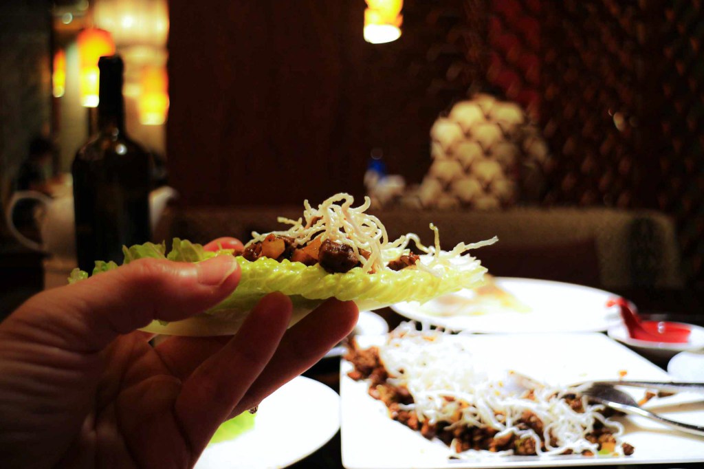 清新的蘿蔓葉,在凹朝處添上加剁碎的鴨鬆與一些炸絲餅,先做一份給老媽後,然後我也製作一份來吃吃。直接咬下,聽到一聲聲清脆咔滋的聲響,這聲音真是迷人、迷惑。果然聲音也會是挑起美食慾望的重點之一。咬下後一陣清脆涼舒爽感,蝦鬆焦香,尤其有熱炒快炒店那種焦香,香的不得了,一口口的細品嚼嚥,真是美味。