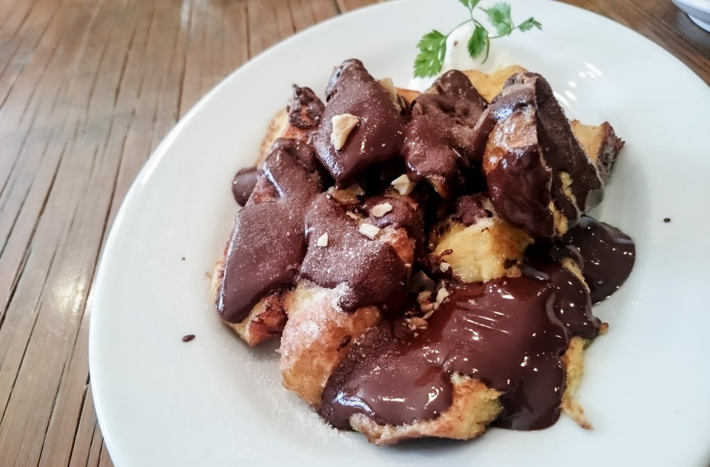 等了一下恰好也可以避避暑,玩玩手機,然後仔細品味咖啡,然後我點的這分巧克力法式吐司就來了。
