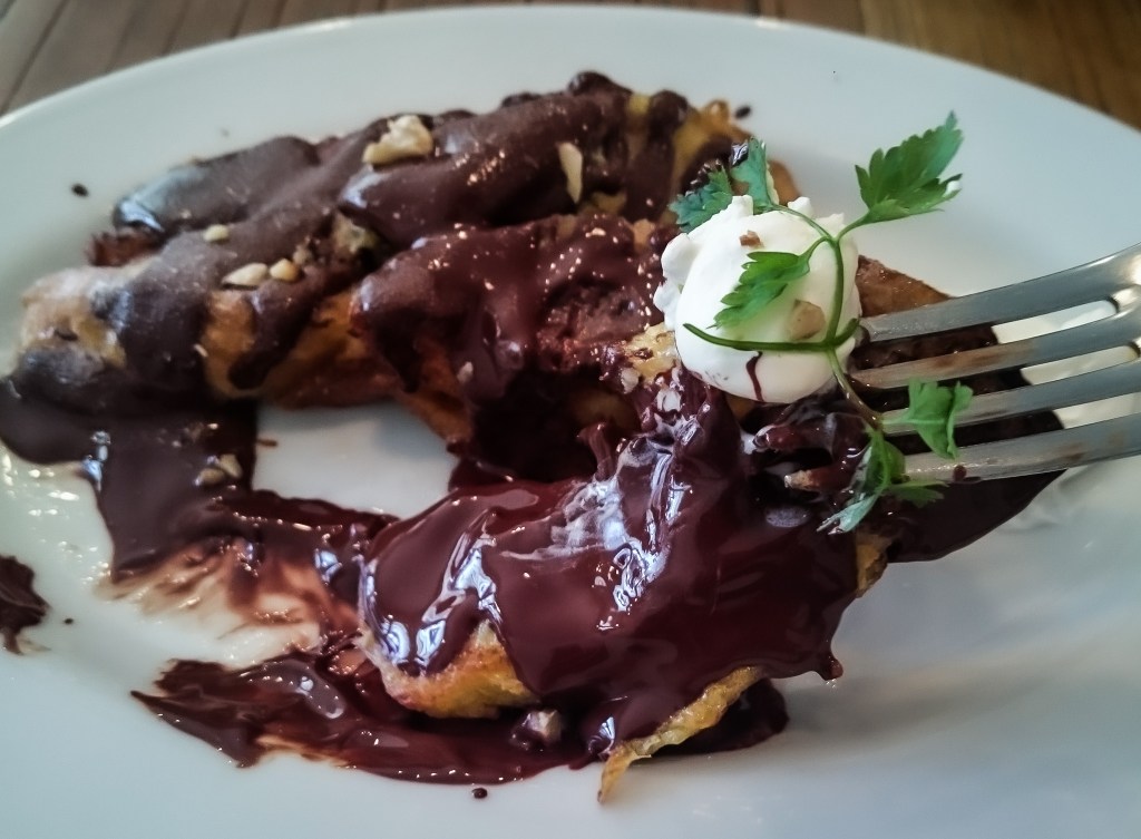 厚重顏色深黑的巧克力醬覆蓋在料理的法式吐司上,一旁還有雪白奶油以及陪襯的薄荷葉。看來這一份甜點,應該就是一份手做點心吧。