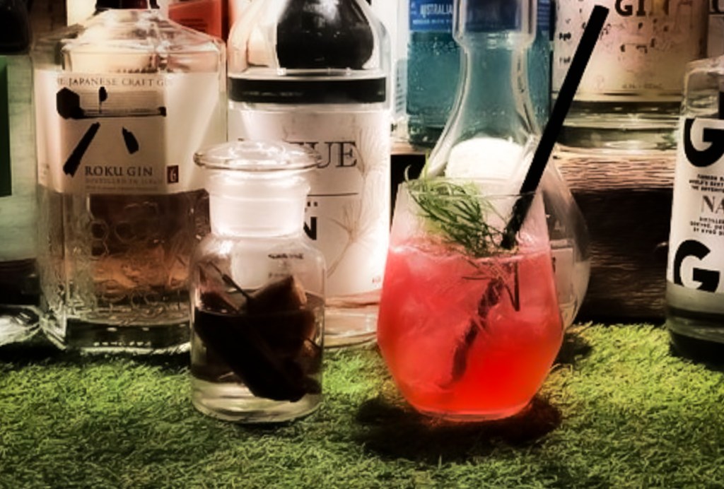 好的,今天第一杯就來一杯稀奇古怪的調酒「Bug’s life」(Flower Gin/Roselle /Lemon Juice/Tonic Water/Cinnamon/Dill/bug)。第一杯「Bug’s life」。這這名字就直覺讓我感受十分驚悚但值得挑戰。當時我心想,來京都不就也要來一點驚嚇之旅嗎。所以選了這一杯「蟲蟲的一生」,調酒師用flower gin、roselle、lemon juice、tonic、cinammon、dill、bug等等調製這杯雞尾酒。
