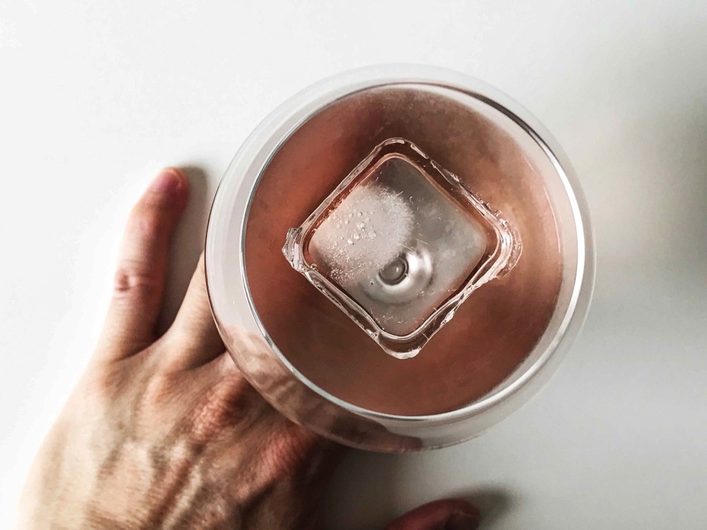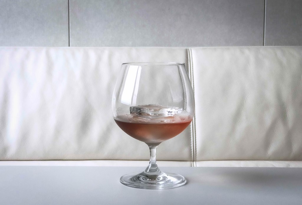我加一顆冰塊,30ml清酒,攪拌一會兒,色調更可以說是淡粉紅,就像是冰涼的酸梅湯的顏色,淡淡的粉紅。