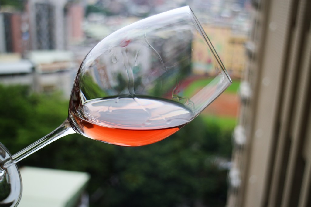 酒緣銳利,由外緣的透明逐次成為淡肉色、菊橙、粉紅進入較為集中的淡粉紅,搖晃酒杯,酒腿銳利細緻,沿杯腹緩緩降流。