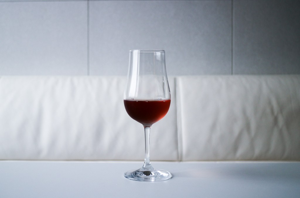 我飲下,溫和酸度當先而苦鹹在後,麻感香甜則其次,最有趣的是酸甜收尾。尾韻,酸酸甜甜好像吃草莓優格,不能說沒有酒氣酒感,往那方面想酒就不好喝了,往氣味層次專研,卻發現好有趣,好順口。