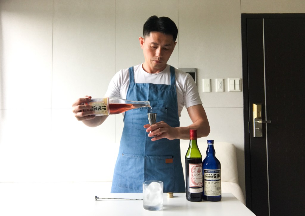 準備好材料之後,取出一款圓口透明的威士忌杯,接著將準備材料,加入冰塊冰鎮一下,準備依照比例調製。也確實,一般來說Negroni的比例是1/3、1/3、1/3,所以,儘管用紅清酒取代,我仍遵照經典製作的比例調製。