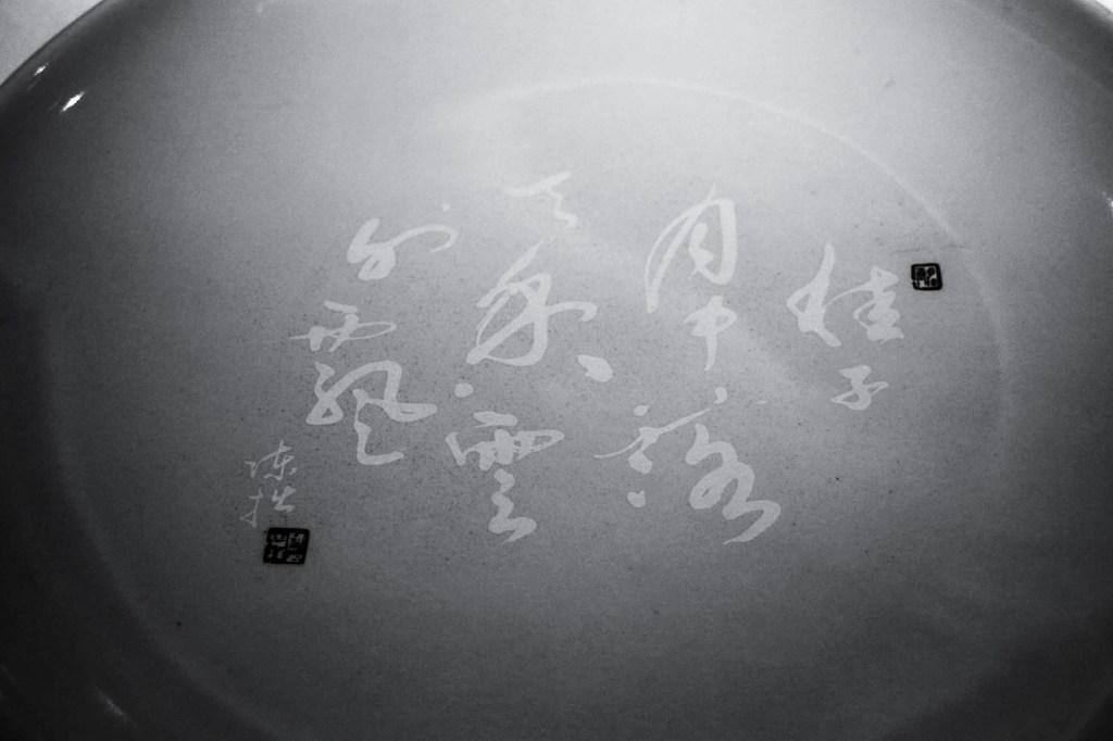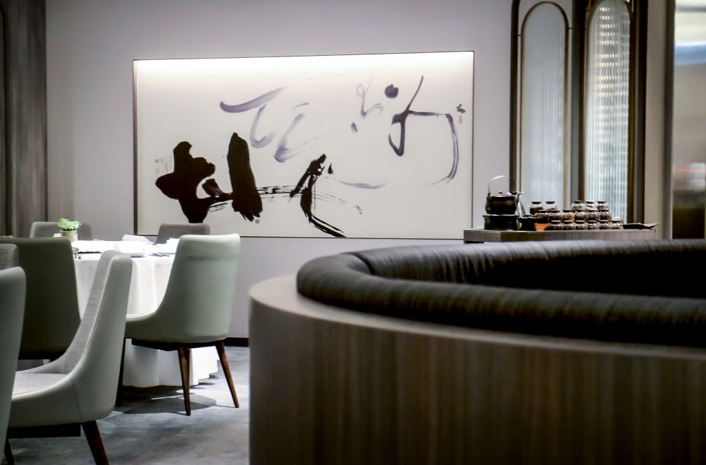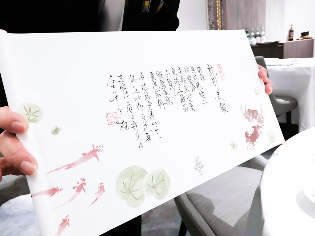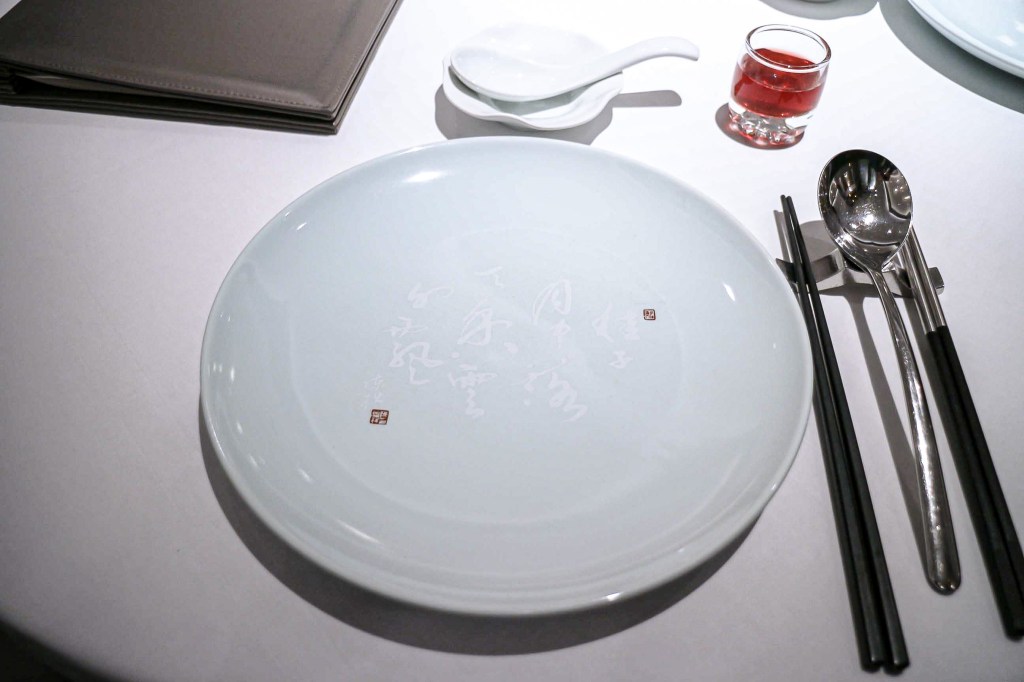 到了餐廳門口,服務人員相當有禮,在確認訂位與消毒後引導我們入座,白色的桌布以及燒製有關天香樓一詞的詞句盤具,格外有些新意與情境。餐廳的菜單上有套餐、季節套餐,也有單點與茶單,十分與時俱進,尤其以中餐廳的特點與傳統品飲習慣結合,有了侍茶的角色存在。此外,還會將今日所點的菜肴寫作字捲作為紀念。