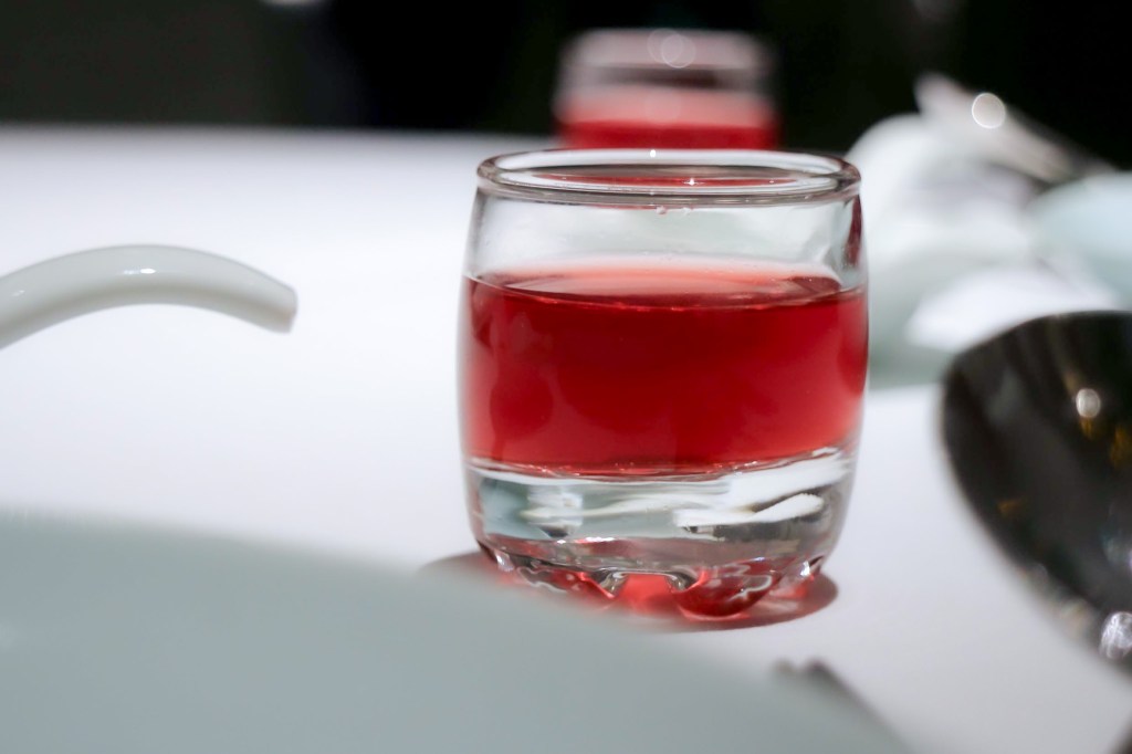 入座不久後,服務人員便會上這一小杯的紅色的開胃飲「果醋」。這杯果醋味道像是蔓越梅等類似的果莓,順口而帶些酸醋感,不會太刺激而且還滿開胃,爽口的。