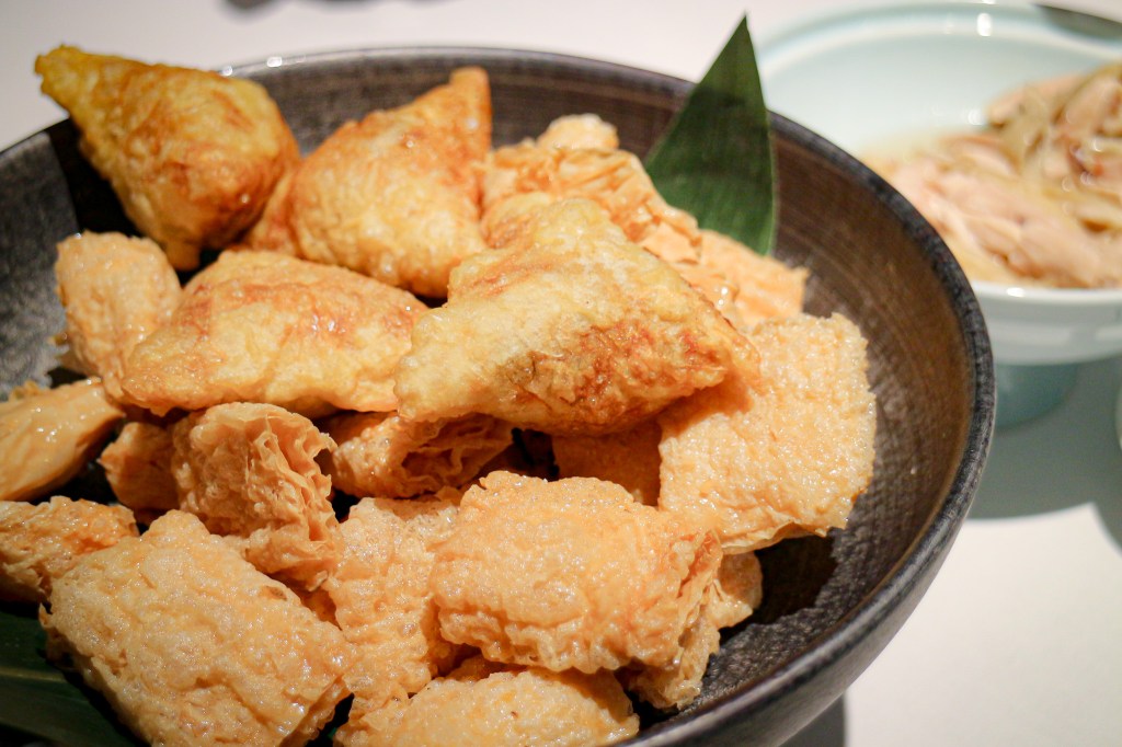 而三角裡包的是豆皮夾竹筍、香菇、芹菜的餡料,但滋味感覺像有豆腐,像百葉,但整體不會太過飽滿,也不會有不舒服的膩味感,入口很簡單,而且對我來說就是旨味。