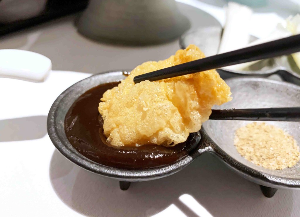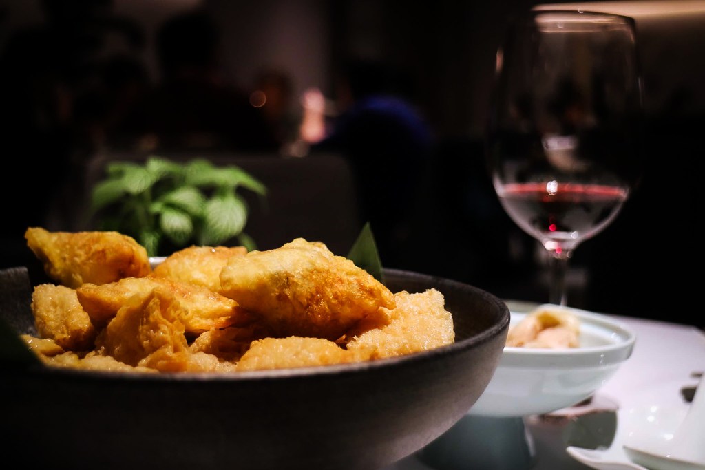這兩道前菜,雖然都是小碟,但實際吃起來,尤其對兩人而言,其實份量算是不少,畢竟還有後面的菜餚啊。接著上的第三道菜是點心「酥炸響鈴」。