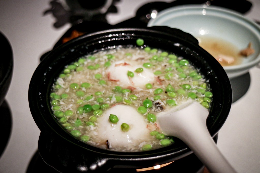 這些前菜部分都滿多的,不過慢慢來,不用趕。餐廳只是依時序上菜,每道菜上來的時間並不會相隔太短或太久,是十分流暢平穩的上菜。緊接著服務人員端上的是第四道湯品「宋嫂魚圓羹」。羹湯裡也如前點菜時幫我們多添加一顆魚圓。我將它分裝在服務人員幫我準備的兩個小碗中。