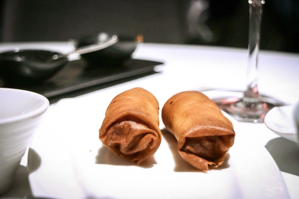 接著服務人員再上下一道菜,是第五道菜仍是點心「蝦肉春捲」。