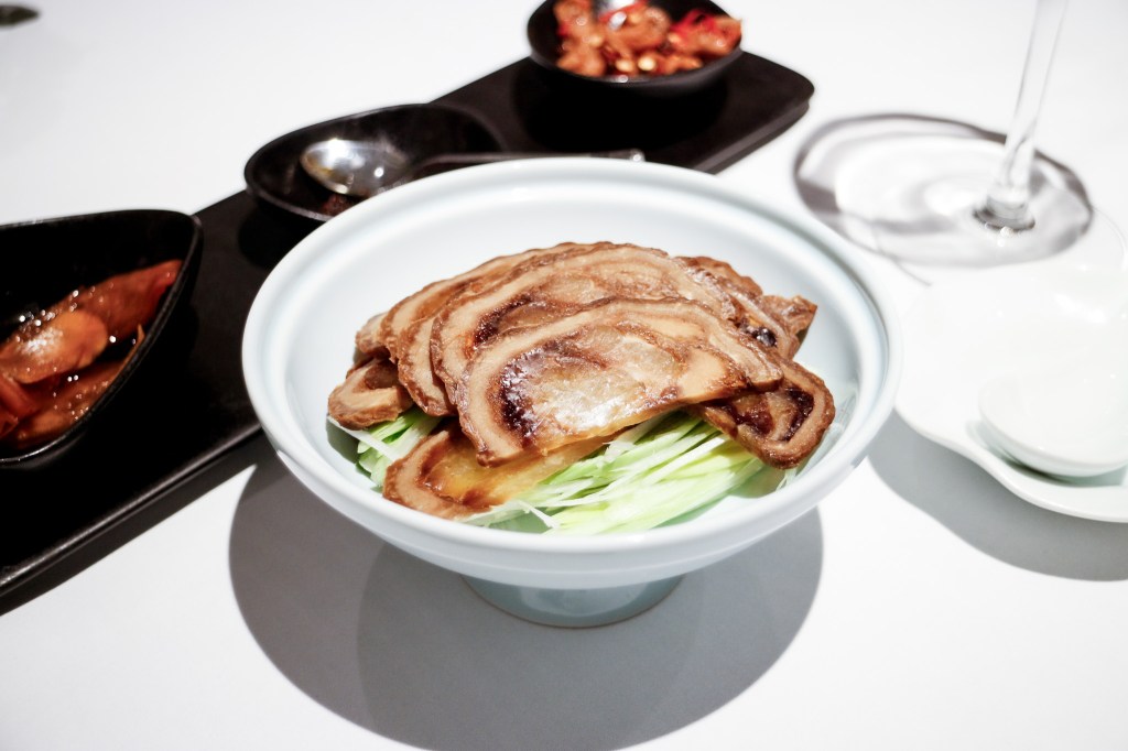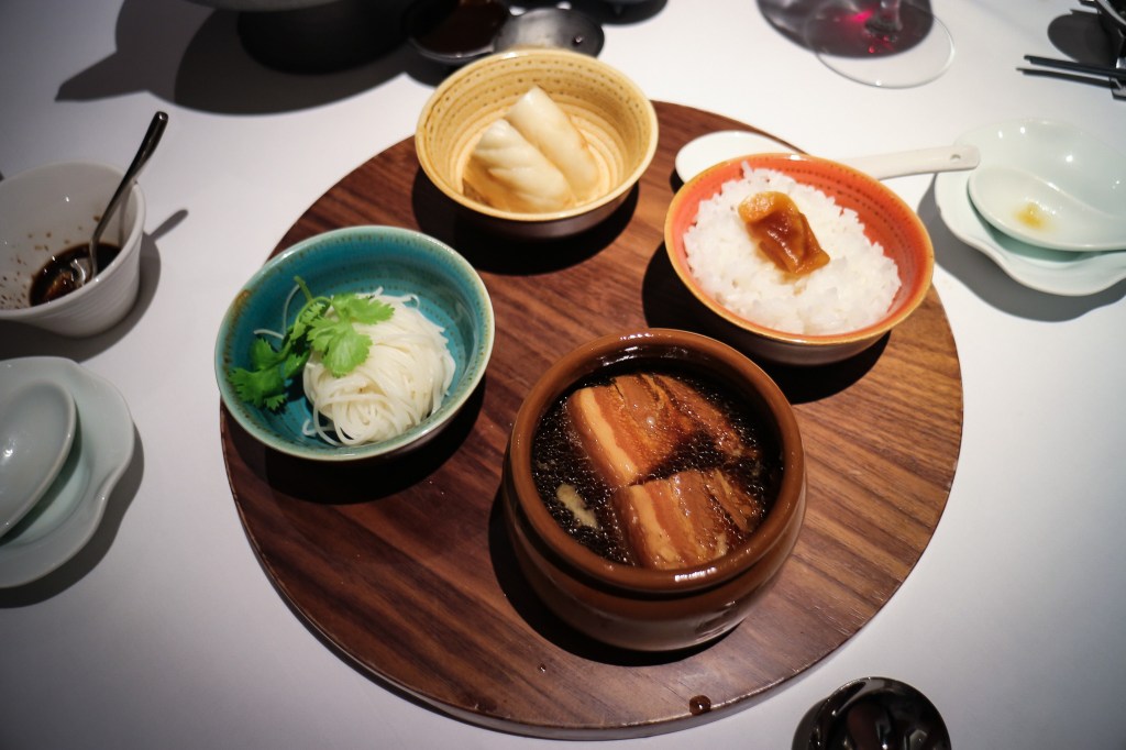 我心想,太好了,餐廳在這方面很靈活,馬上能掌握顧客心理。主餐部分,我選擇「天香東坡肉佐三御品」,我又問這道主菜的份量,服務人員告知,料理除了東坡肉外,還有搭配醬蘿蔔香米飯、天香麵線與手工泡饃,份量是相當足夠的,建議可以做分享。而最後的甜點則選擇「棗泥香鍋餅」。