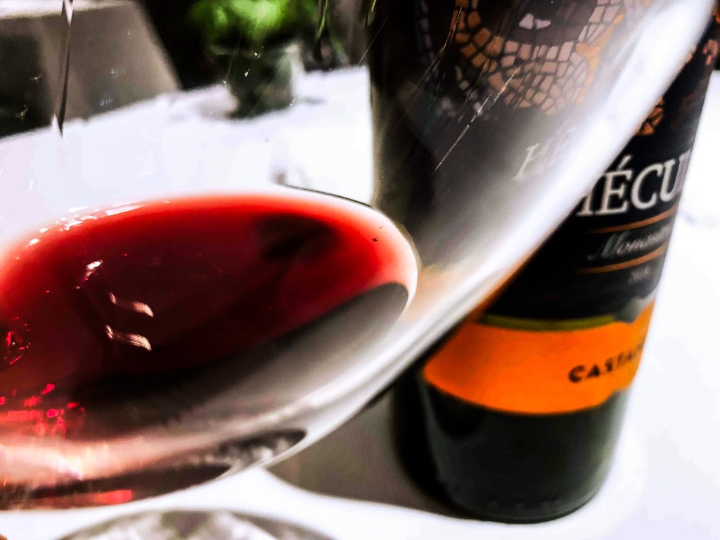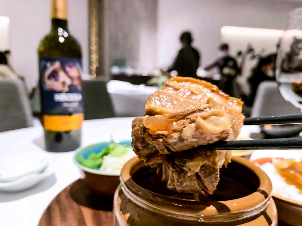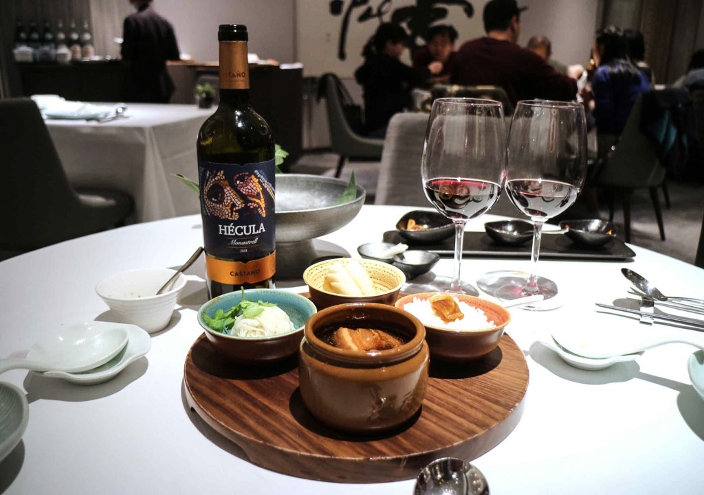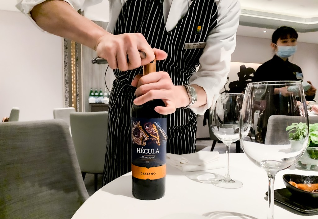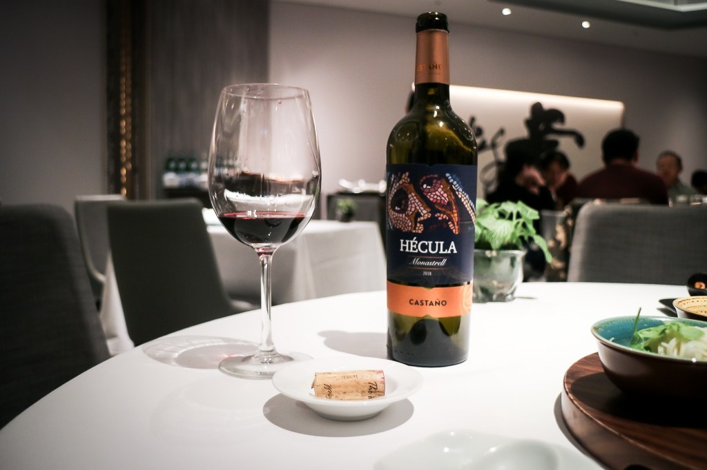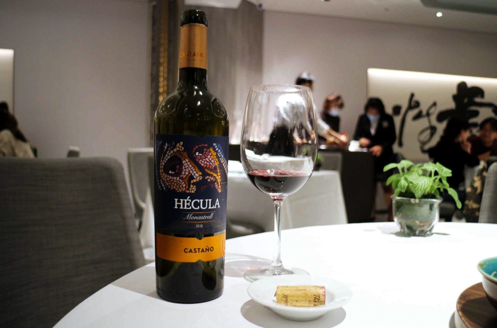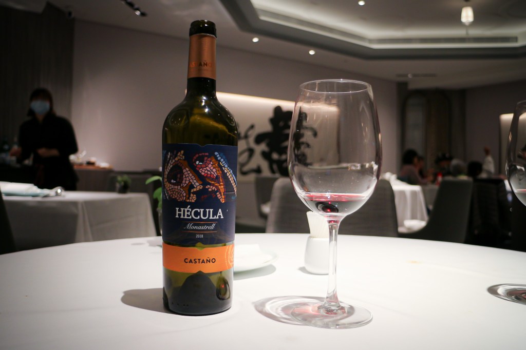 好的,關於葡萄酒呢?我還是挑了一支基本價位的葡萄酒,也是侍酒師推薦適合搭配東坡肉的西班牙葡萄酒Bodegas Castaño Hécula Monastrell 2018(產地:Spain 產區:Murcia, Yecla 葡萄品種:100% Monastrell)。經過侍酒師讓我確認葡萄酒,並稍微介紹這款來自西班牙東南部Yecla產區的葡萄酒,該區與法國南部葡萄酒產區隆河谷相近,適合搭配今日的東坡肉。