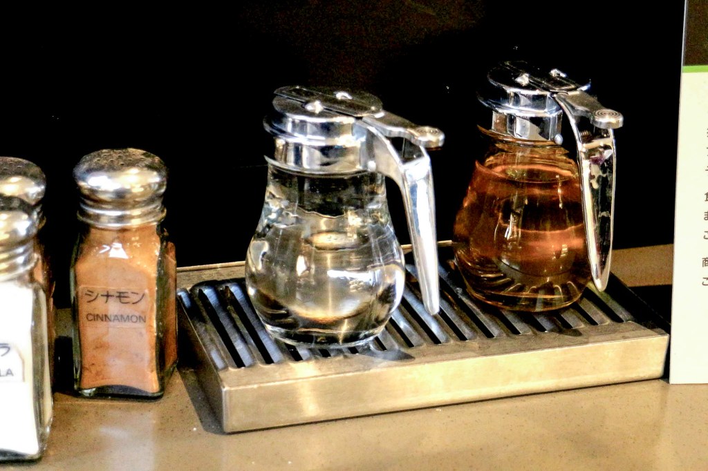 門市有個特別的地方就是自助的吧台上有瓶裝的風味糖漿..這會不會太好了一點,在台灣壓個兩下要15塊吧!!不過話說回來,飲料的價格確實比台灣高一點。
