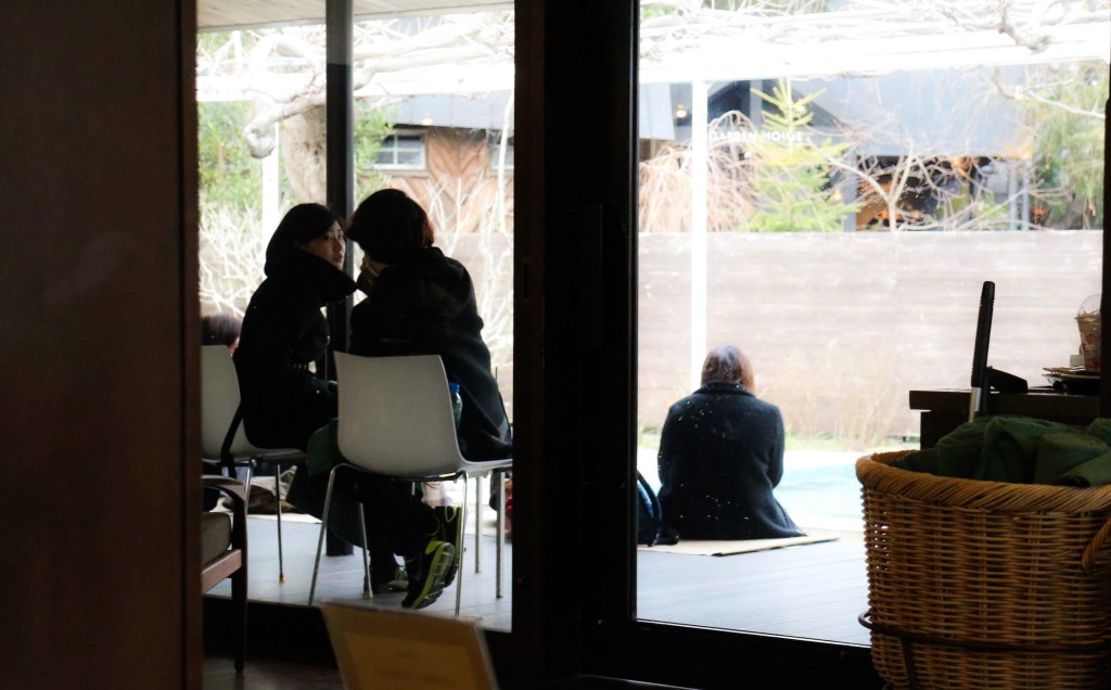 在室外除了機張面對游泳池的桌面外,地板上還有幾席舖設席子的座位,十分凸顯日本文化特色。「我從來沒有在星巴克座過候位區」我有點小驚奇的說著。由於座位全滿,鎌倉星巴克伙伴請我們坐在候位區等後,他會管制並做安排。