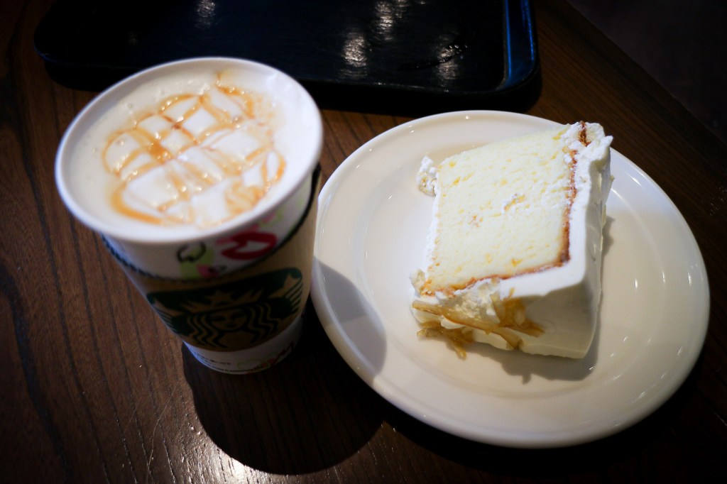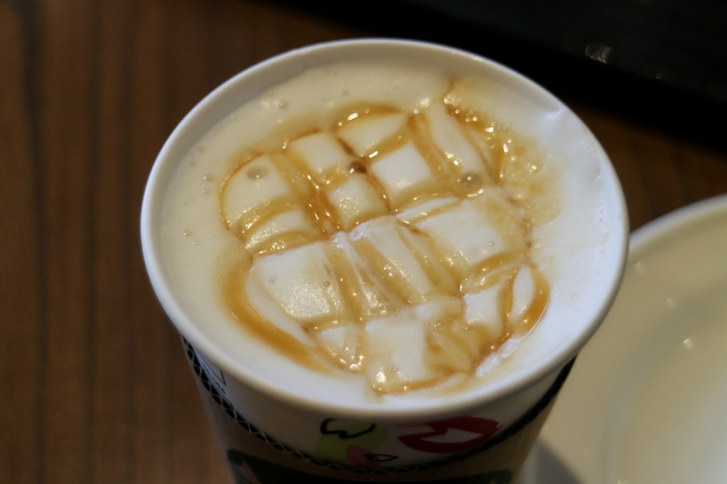 其實這時候星巴克的飲品開始會有些創意,但是此時想要田一點的滋味,所以選了個老點飲品一杯基本款的調和咖啡「焦糖瑪奇朵」。哈哈….其實,那麼…這樣的看來,焦糖瑪奇朵的水準似乎與台灣沒什麼不同。不過坐下來休息,喝個熱又甜的有牛奶的咖啡,心情稍微舒服些。