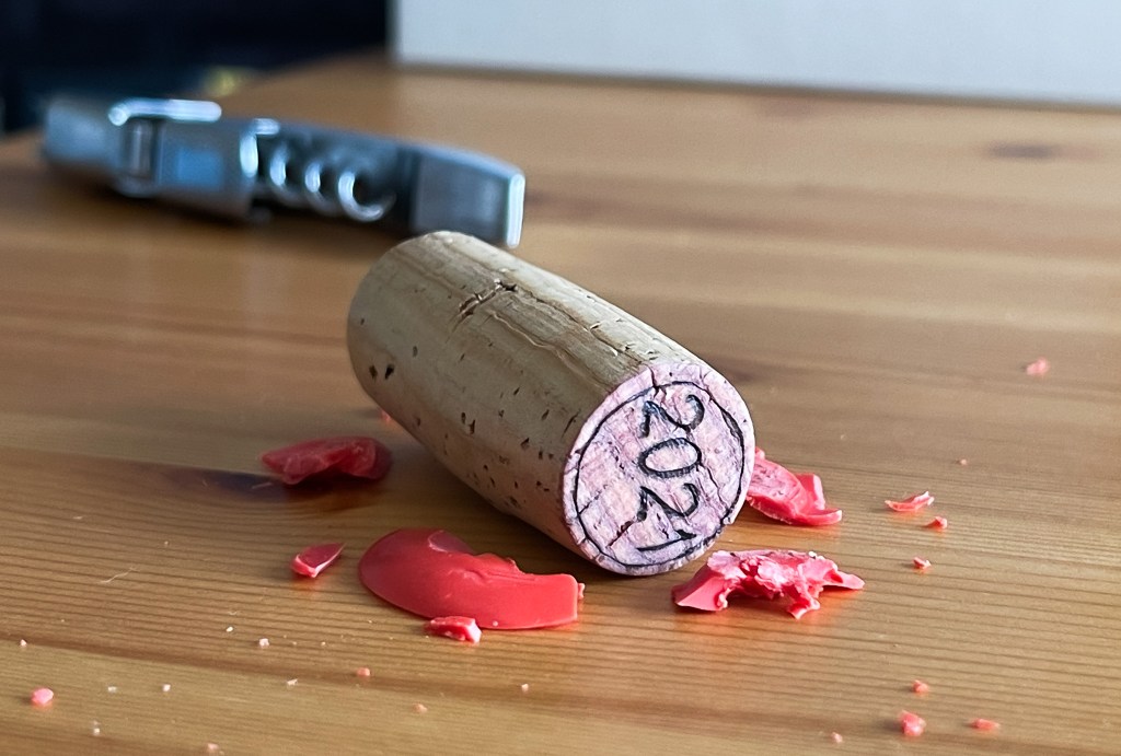 我取出海馬刀直接鑽穿橘色蜂蠟進入酒塞,這款的蠟封很好,鑽入即破裂,不會泥黏。我取出酒塞後,再將周圍蠟封稍稍撥開,避免臘掉入葡萄酒瓶內,此時飄出一陣精緻細膩的果香氣與植物香氣,以及木質氣味。